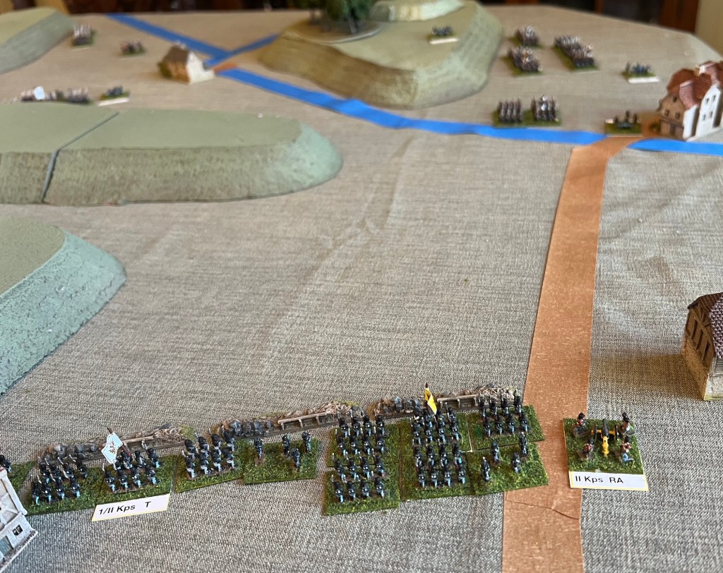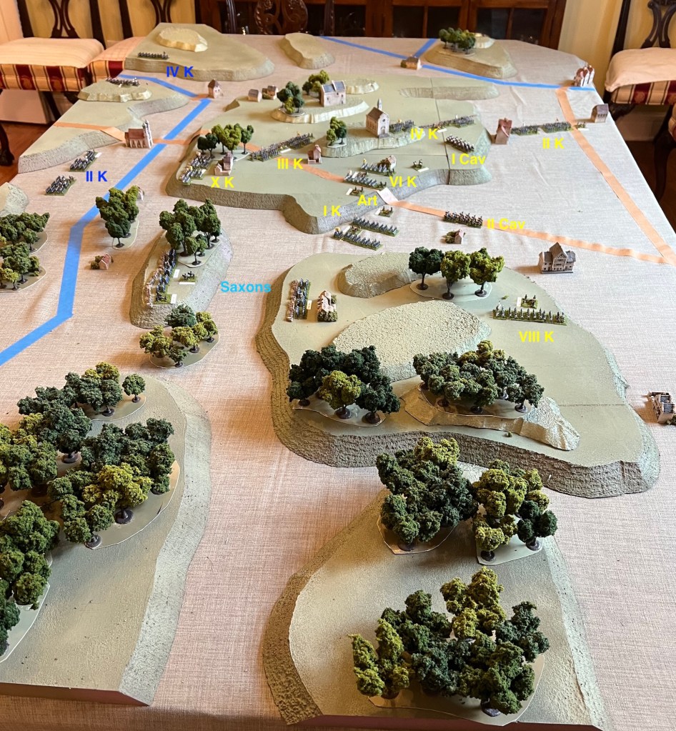 The Prussian offensive got off to a mixed start. II Korps advanced within short range of the Austrian X Korps, but the corps artillery didn’t move. IV Korps had a mix of full and half moves, while the III Korps artillery moved, but the infantry didn’t (the 6th Division failed its roll, and the 5th Division behind it stayed in place).