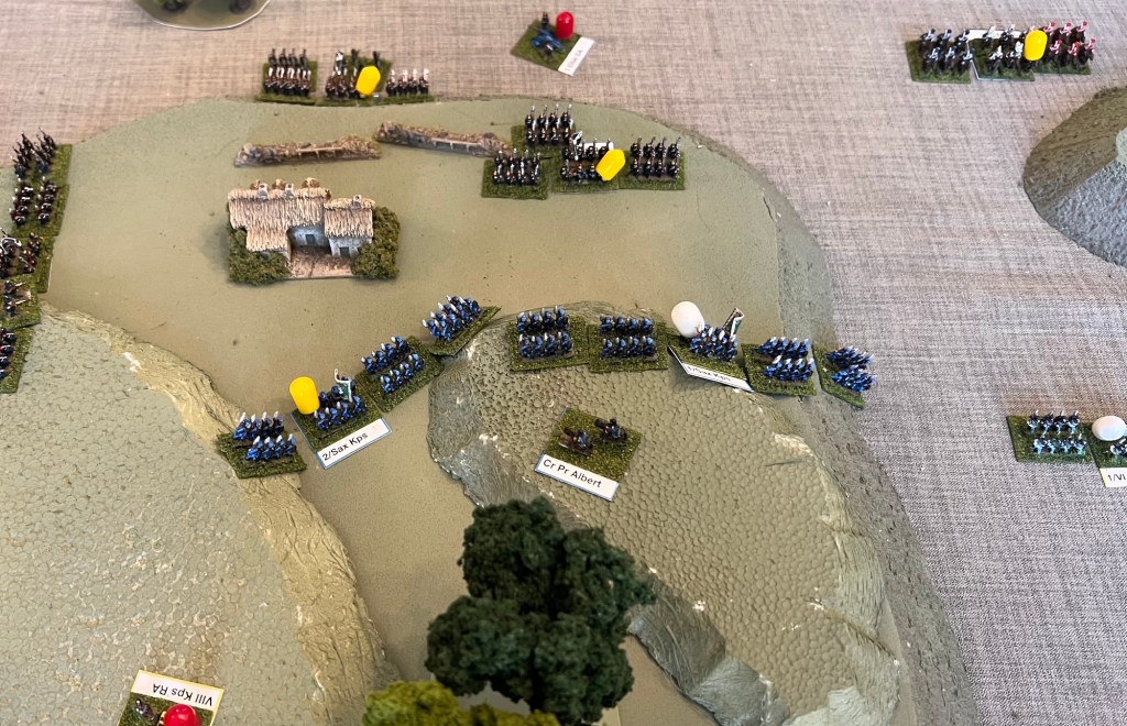 The Elbe cavalry charges the Saxon cavalry and expects the 14th Divisions to support. No such luck as the 14th Division does’t move. Slight advantage to the Prussians but the Saxons hold and force the Prussians to retreat. Seeing an opportunity the Saxons now charge the Prussian cavalry but enter into the long range of the 14th Divisions. All the Prussian infantrymen’s frustrations from the delays is released onto the Saxon cavalry and the division is shattered (actually rolled a 12). The 14th Division is now free to turn the southern flank.