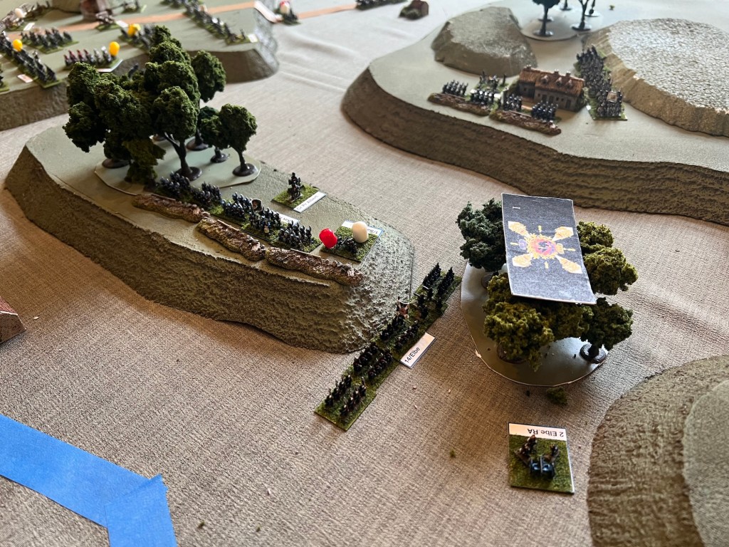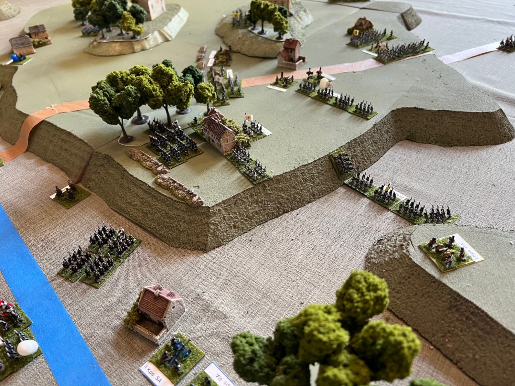 In the south the 14th Division charged the remains of the VIII Korps and swept it aside. Simultaneously the 15th and 16th Divisions charged the 2nd Saxon Division. The 16th was stopped by the Saxon’s fire, but the 15th charged home and push the division back out of the rifle pits. At that point the 14th Division hit the Saxons in the flank. In a cool display of soldiering, the Saxons were able to beat off the Prussians (Saxons rolled a six, Prussians a 1). C’est la guerre.