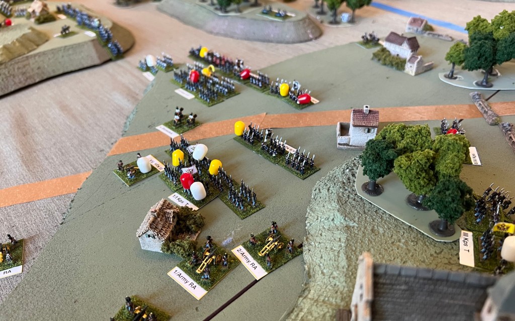The Prussian V and VI finally got moving with 10th and 11th Division moving to provide fire support (only rolled half moves) while 9th Division charged home. 12th Division didn’t move. The defending Brigades Saffen & Wüttemburg only cause slight damage to the approaching Prussian, but in-turn was disrupted by the Prussian fire. However the brigades did throw back the Prussian attack and held their position, precarious as it was.