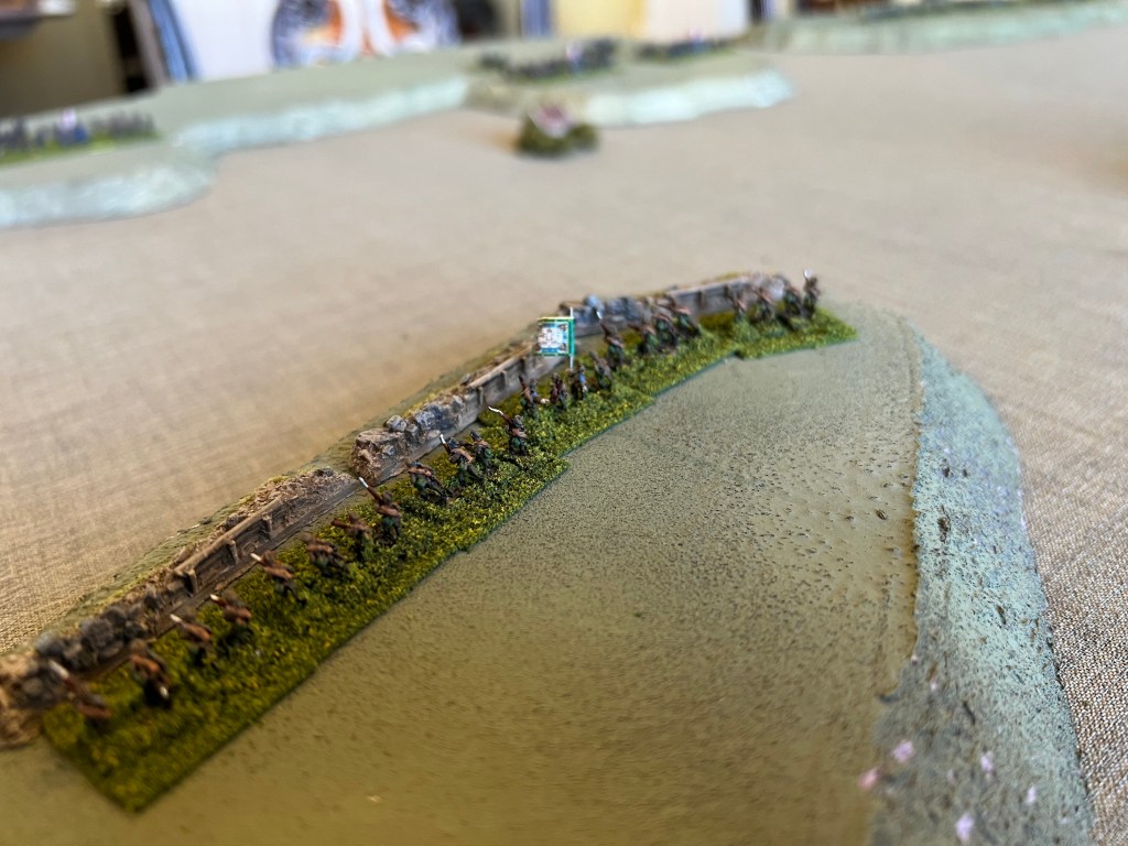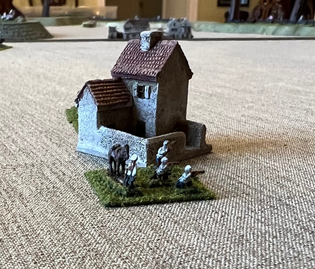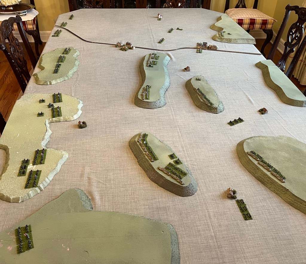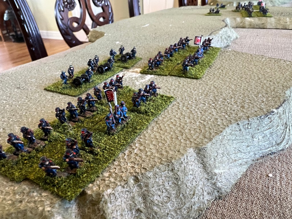 Finally a RJW post. My previous battles have been fought using proxies as I assembled figures better suited/painted for the RJW. No company makes a 6mm RJW line, so proxies had to be selected and painted to serve in the role. On line research indicated that none of the 6mm lines that offer possible figures work well together. I like the Baccus line of 6mm figure and decided to stay with that company and work through the limitations. Figures are based to play using the Bloody Big Battles rules with a figures scale of 1000 infantry, 500 cavalry, and 24 guns per base. Ground scale is normally 333m per 1″ (12″ per 4000m). Time scale is normally one hour.